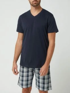 Der Pyjama von Bugatti ist aus Baumwolle gefertigt und gerade geschnitten. Er kommt mit V-Ausschnitt am Oberteil und Shorts mit Karomuster.