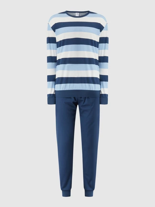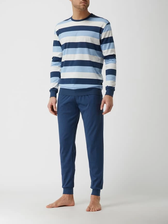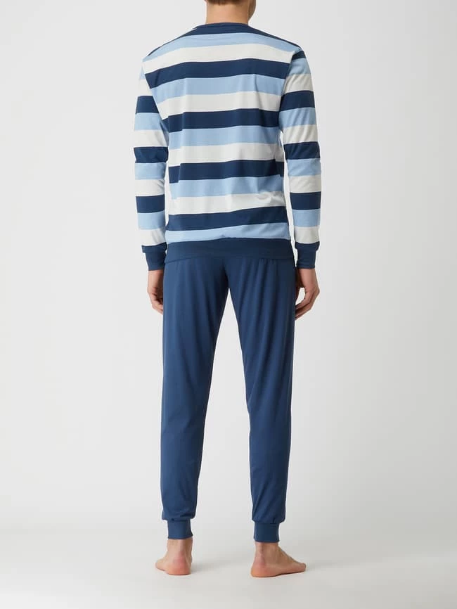 Der Pyjama von CALIDA ist aus reiner Baumwolle gefertigt und locker geschnitten. Das Oberteil kommt mit Streifenmuster, Rundhalsausschnitt und langen Ärmeln. Die Hose zeigt sich mit elastischem Bund.