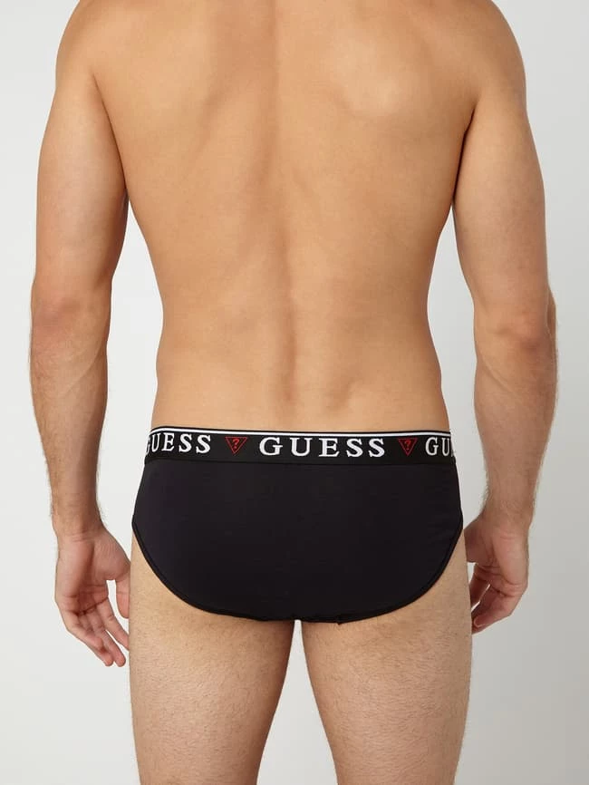 Der Slip von GUESS ist aus einem Baumwoll-Elasthan-Mix gefertigt und ohne Beinansatz geschnitten. Er kommt im 3er-Pack mit elastischem Logo-Bund.