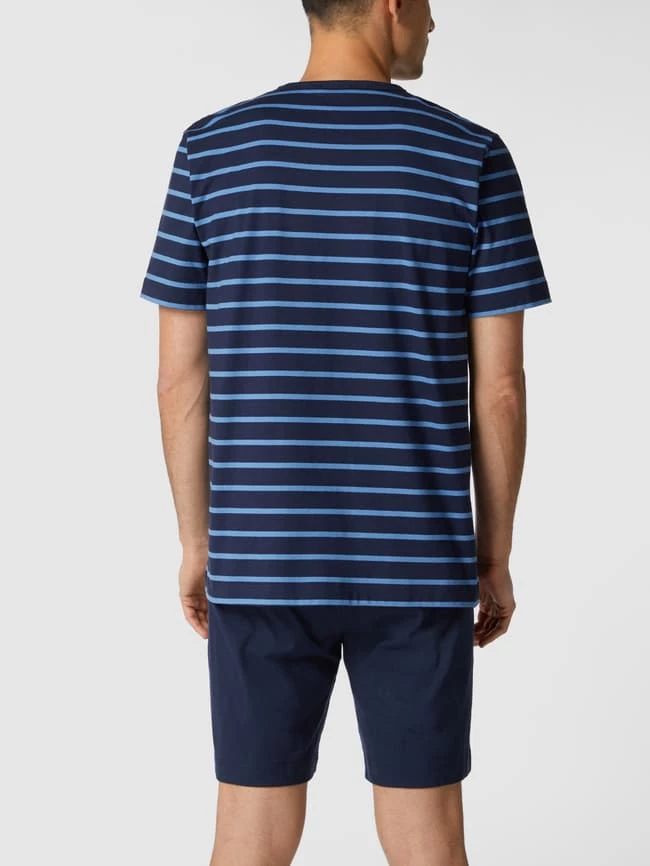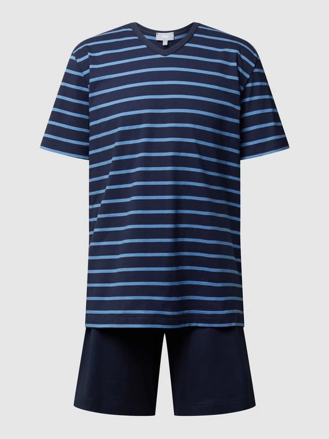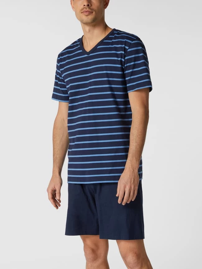 Der Pyjama von Mey ist aus reiner Baumwolle gefertigt und gerade geschnitten. Er kommt mit Streifenmuster am Pyjama-Oberteil, V-Ausschnitt und Pyjamashorts.