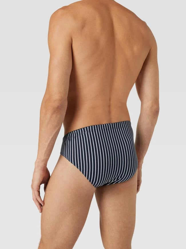 Der Slip von Mey ist aus einem Baumwoll-Elasthan-Mix gefertigt und in körpernaher Passform gehalten. Er zeigt sich mit Streifenmuster, elastischem Bund mit Label-Patch, Teilungsnähten sowie elastischen Beinabschlüssen.