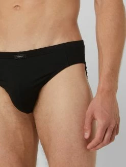Der Slip von Mey ist aus einem Baumwoll-Elasthan-Mix gefertigt und in körpernaher Passform gehalten. Er zeigt sich mit elastischem Bund, Label-Print und Teilungsnähten.