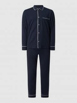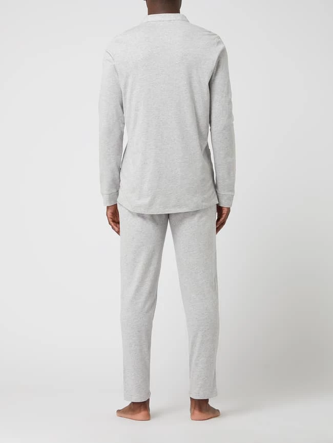 Der Pyjama von Seidensticker ist aus reiner Baumwolle gefertigt. Er kommt in gerader Passform mit Reverskragen, Knopfleiste und Hose mit elastischem Bund.