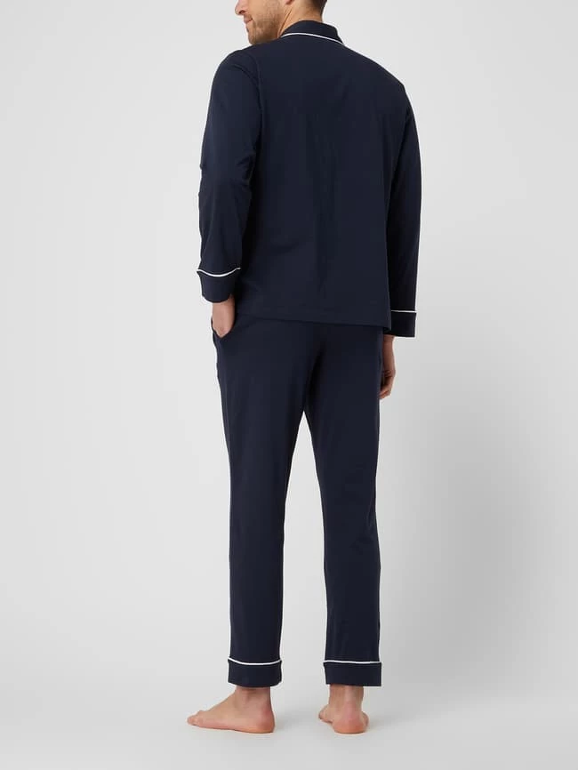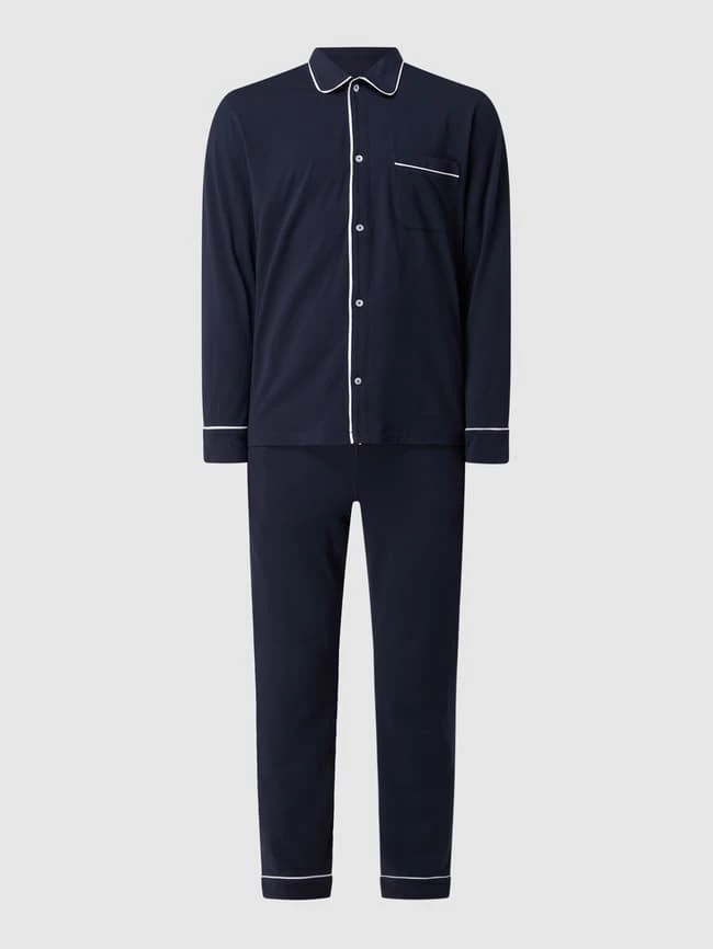 Der Pyjama von Seidensticker ist aus einem Baumwoll-Elasthan-Mix gefertigt und locker geschnitten. Das Oberteil kommt mit Umlegekragen, Knopfleiste und Brusttasche. Die Hose zeigt sich mit elastischem Bund und seitlichen Eingrifftaschen.
